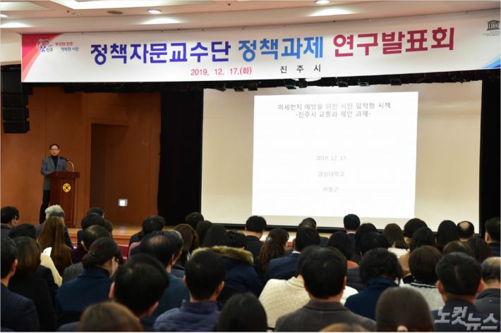 진주시가 17일 시청 시민홀에서 조규일 시장과 정책자문교수, 공무원 등 300여 명이 참석한 가운데 정책과제 연구발표회를 개최했다.